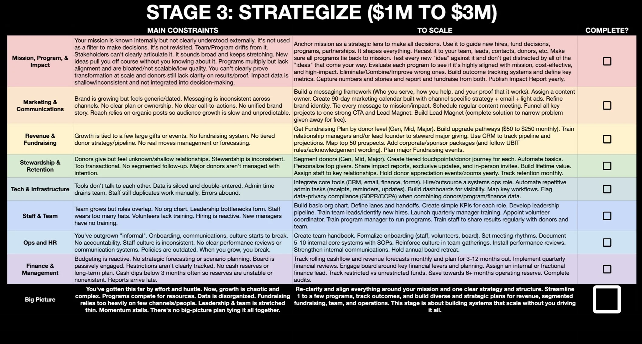 Then we will help you break through your current ceiling and maximize your donor relationships and current systems. Many Nonprofits get stuck around the $250k to $750k mark and also around the $1M and $3M marks. We’ll help to identify what’s needed to grow across the stages as it relates to you.